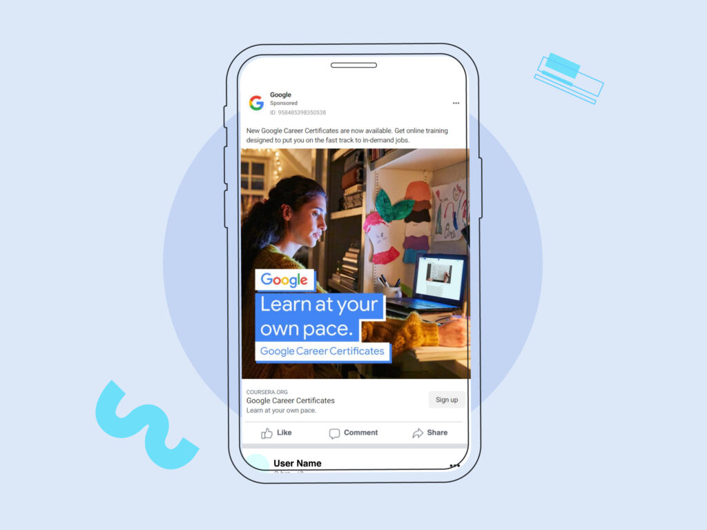 Your CTA may be on point, but the right ad image, motion graphic, or illustration can make or break your Facebook ad performance. Choosing images and ad designs is not an easy task. To come up with the right visual content, you can hire a photographer to take custom photos, get an illustrator to create personalized artwork, or have your graphic designer come up with brand-new engaging visuals and vector elements.